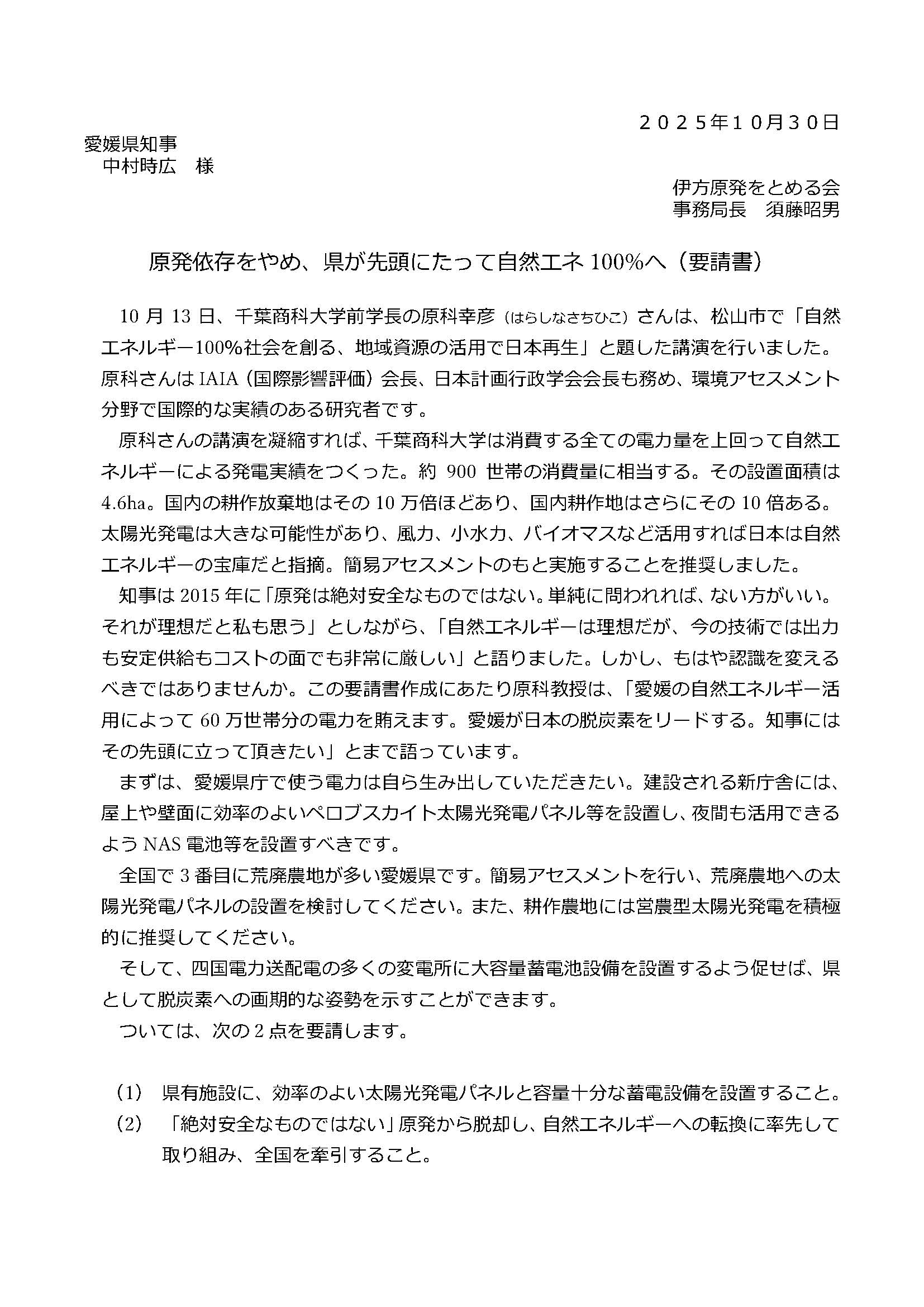 要請書は、自然エネルギー100%大学を実現した千葉商科大学の前学長・原科幸彦さんが、日本の全世帯を自然エネルギー100%にできる可能性を示したことを紹介。知事が自然エネを「出力も安定供給もコストの面でも非常に厳しい」とした認識はあらためるべきだと指摘。全国で3番目に多い荒廃農地を自然エネルギー推進に活用することも求め、次の2点を要請しました。