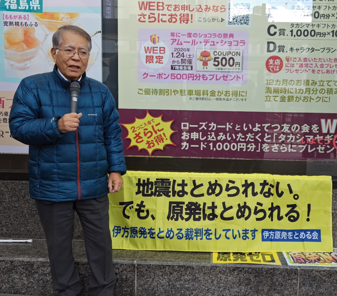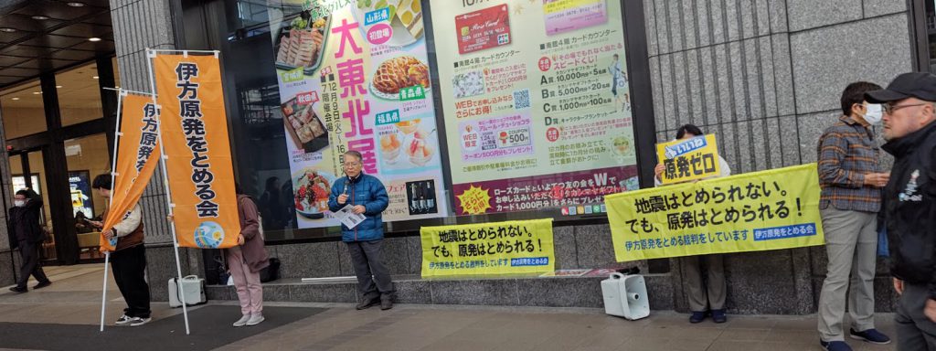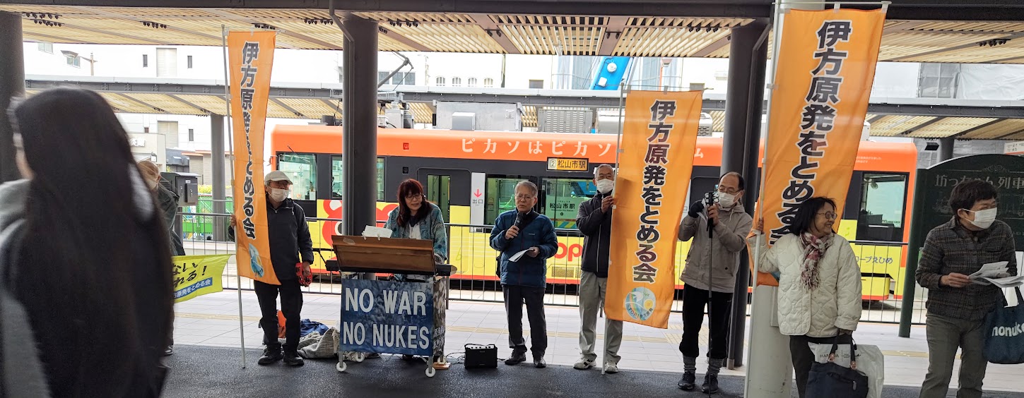 12月3日、松山市駅前の歩道で12時15分から小一時間、9人の参加で「伊方原発いらん!」と通りかかる人々に訴えました。