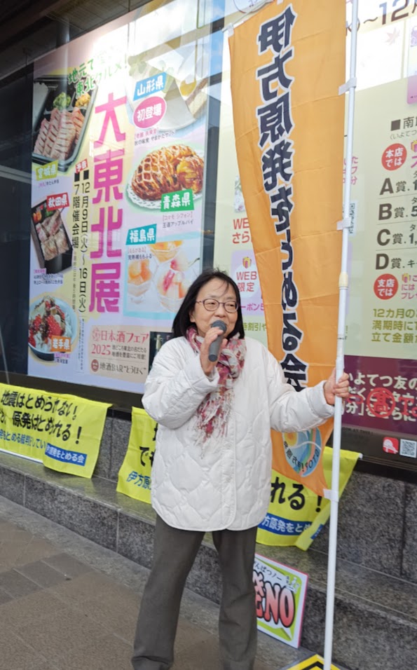 この日は強烈な寒波襲来で、寒風が吹きつけるなか、いつものように幟旗、横断幕でのスタンディング、リレースピーチ、チラシ撒きを行いました。また、原さよ楽団のキーボードに合わせて、アクション参加者がいつもの「歌姫」に代わって「ふるさとは原発を許さない!」と歌を披露する場面もありました。