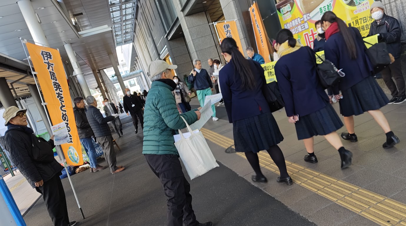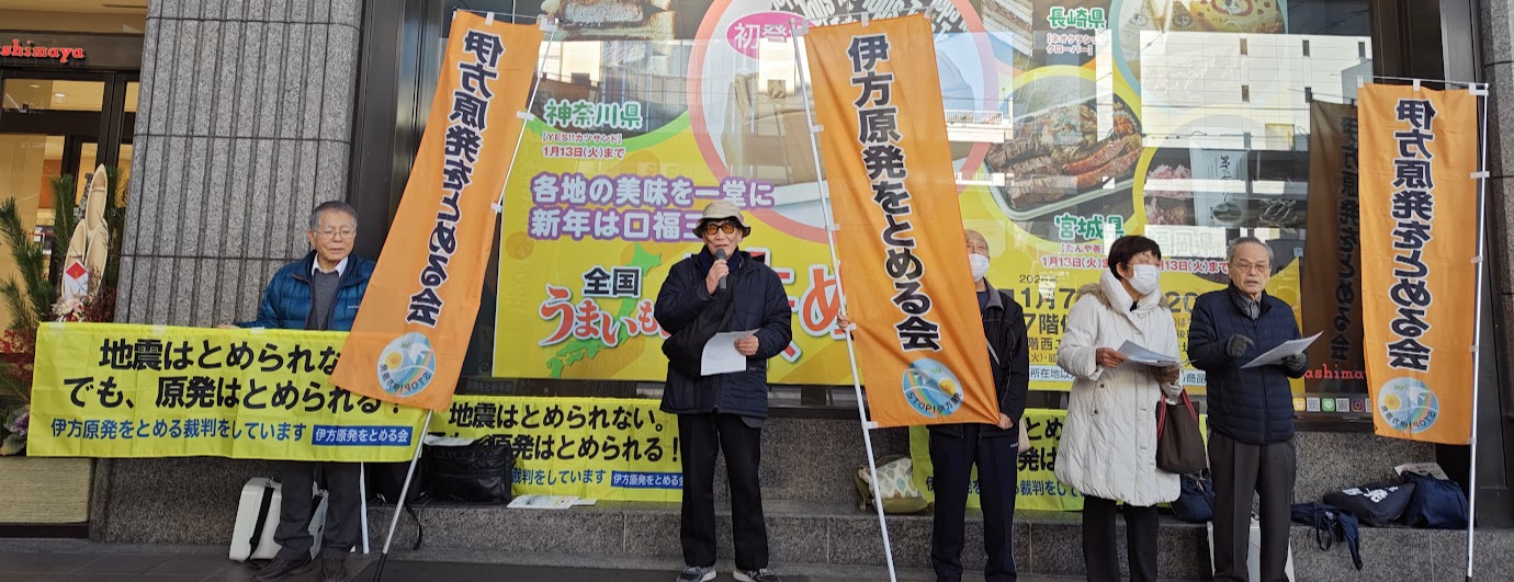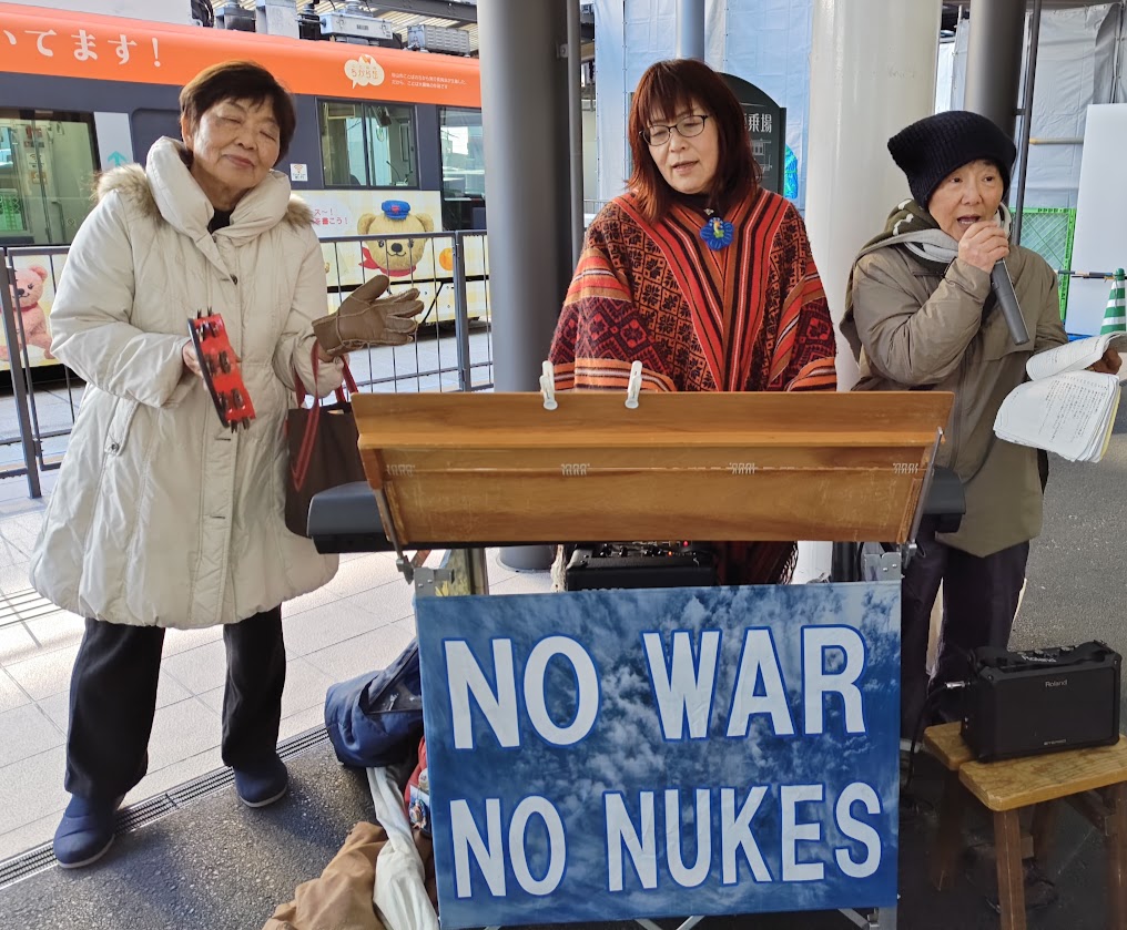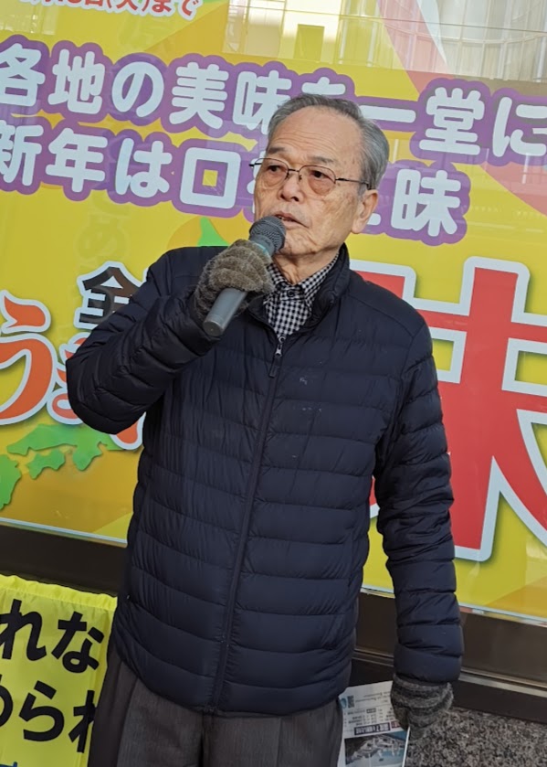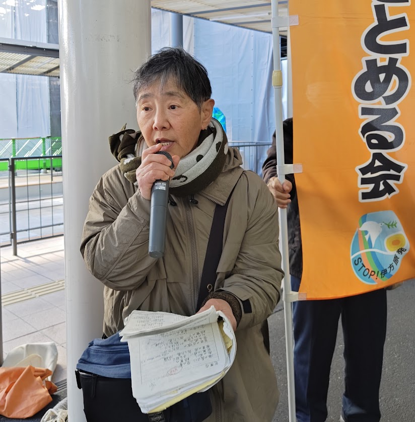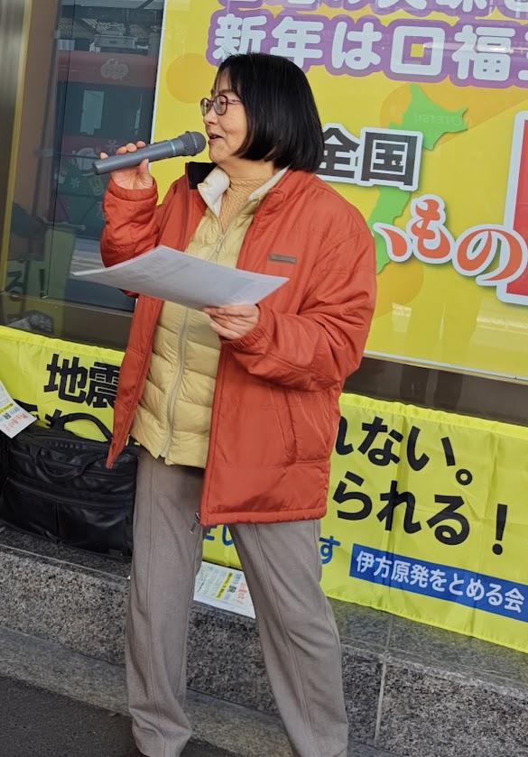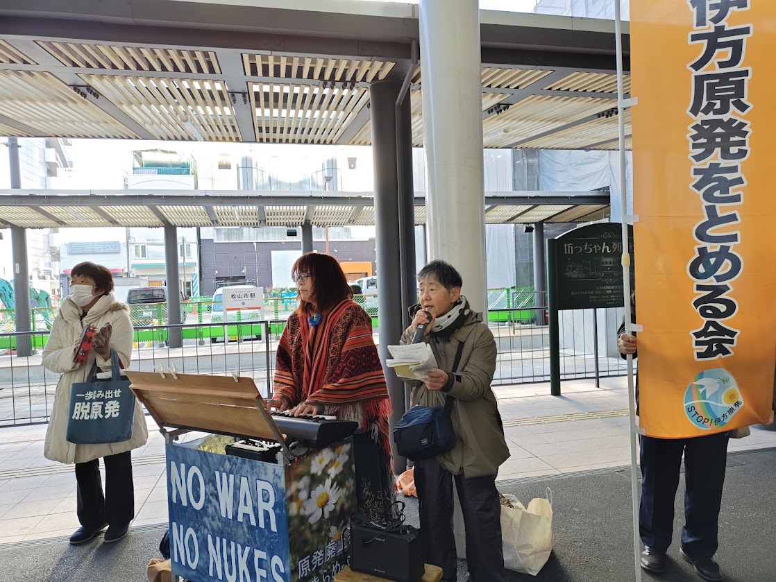 左側は、当会の共同代表・幹事の松浦秀人さん。被団協のノーベル平和賞受賞以来、被爆証言活動で多忙を極め、12月のフランスでの被爆証言活動から帰国して、数か月ぶりのスピーチ。右側は、関東へ移住予定のげんさよの歌姫・松尾京子さん。関東の人々にも伊方原発廃炉を訴え続けてください!そして、時々愛媛にも戻ってきてください。