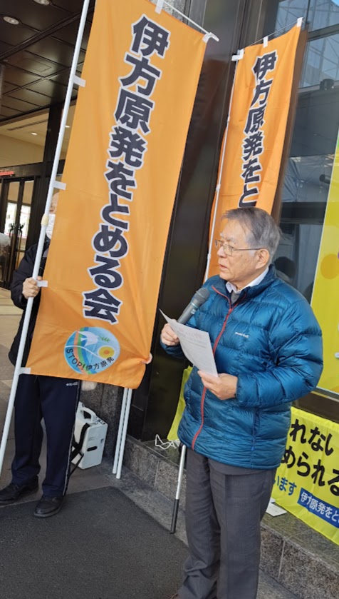 伊方原発をとめる会の幟を掲げながら、リレースピーチ。