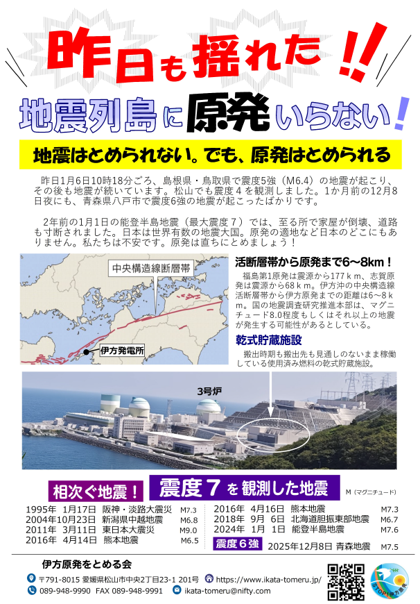 今年初の定例アクションは、島根県東部を震源とする震度5強の地震が起きた翌日となりました。松山でも震度4を記録しました。