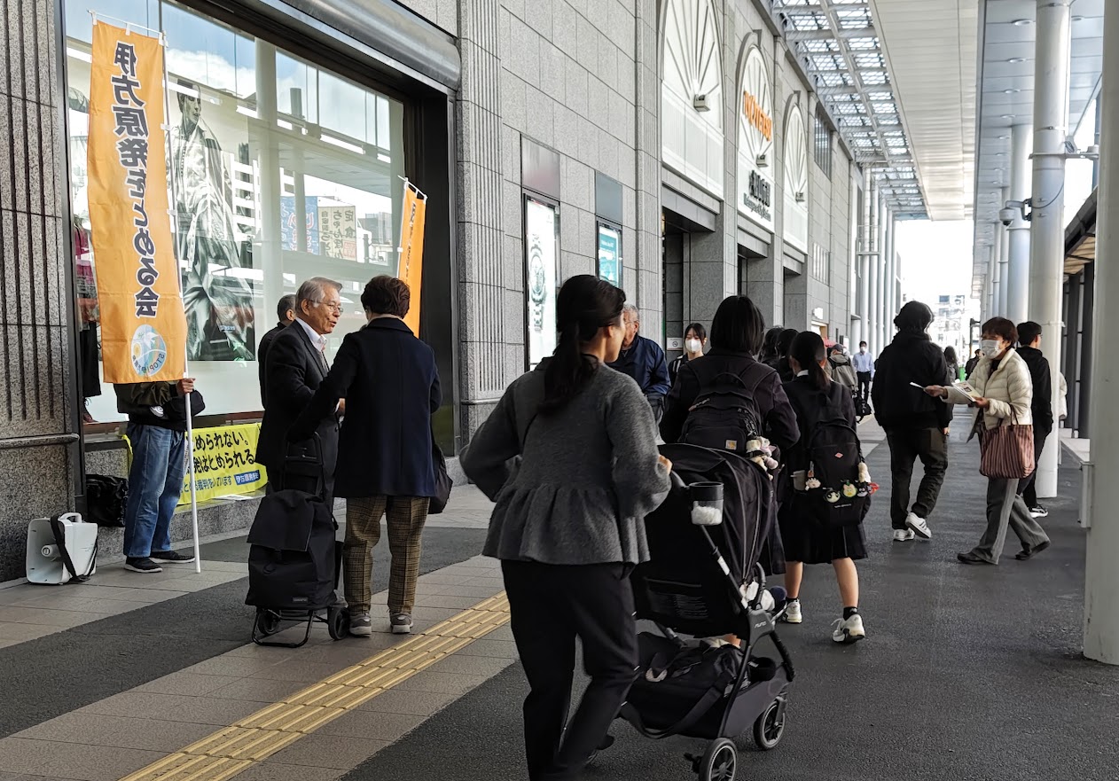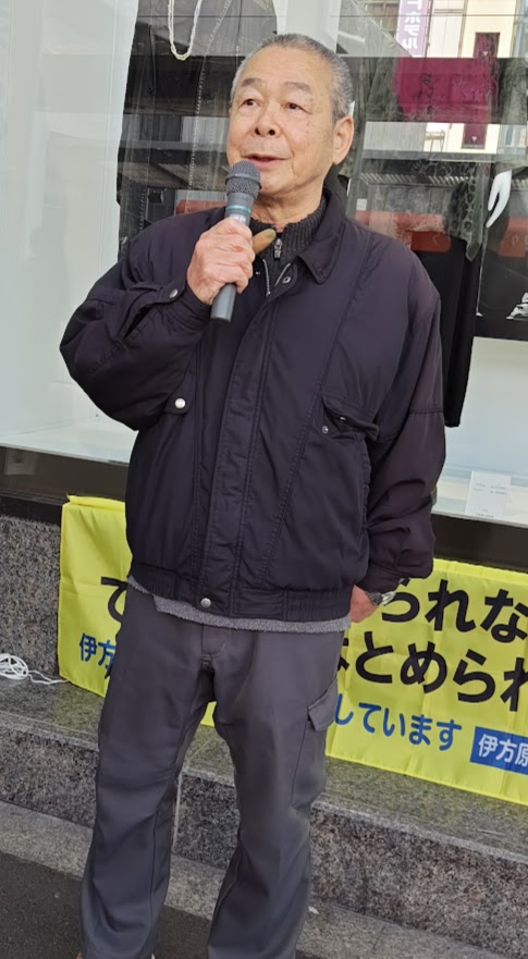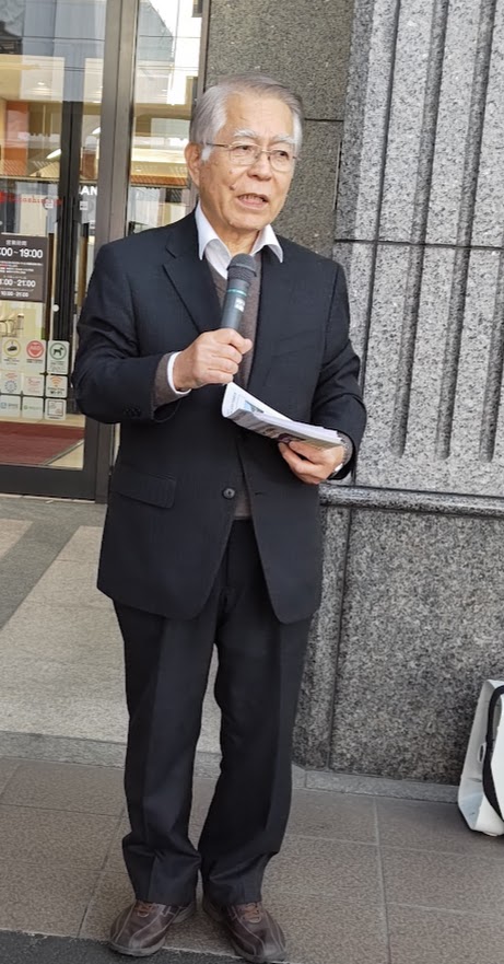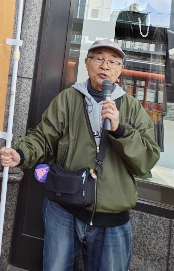 3月4日第一水曜日、3月に入ったとはいえ、時折、寒風が吹き抜ける松山市駅前の路上で、12時15分から小一時間、定例アクションを行いました。