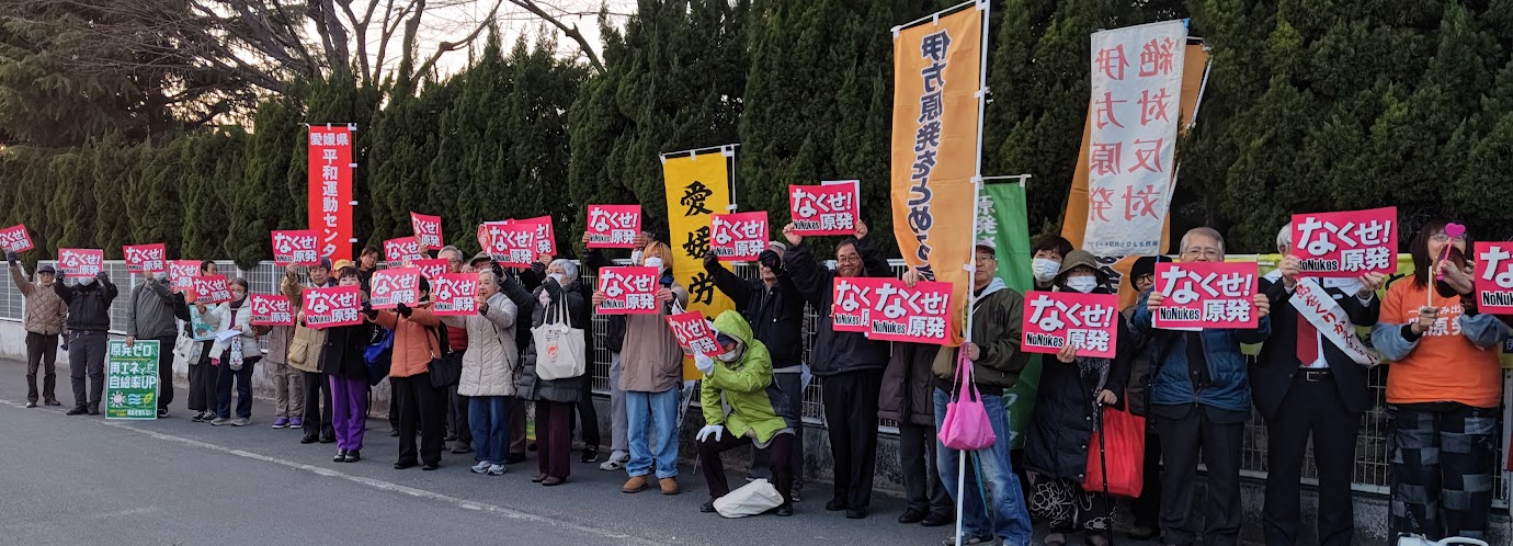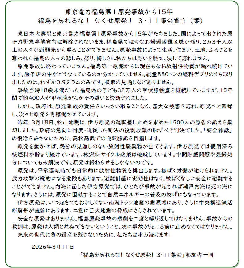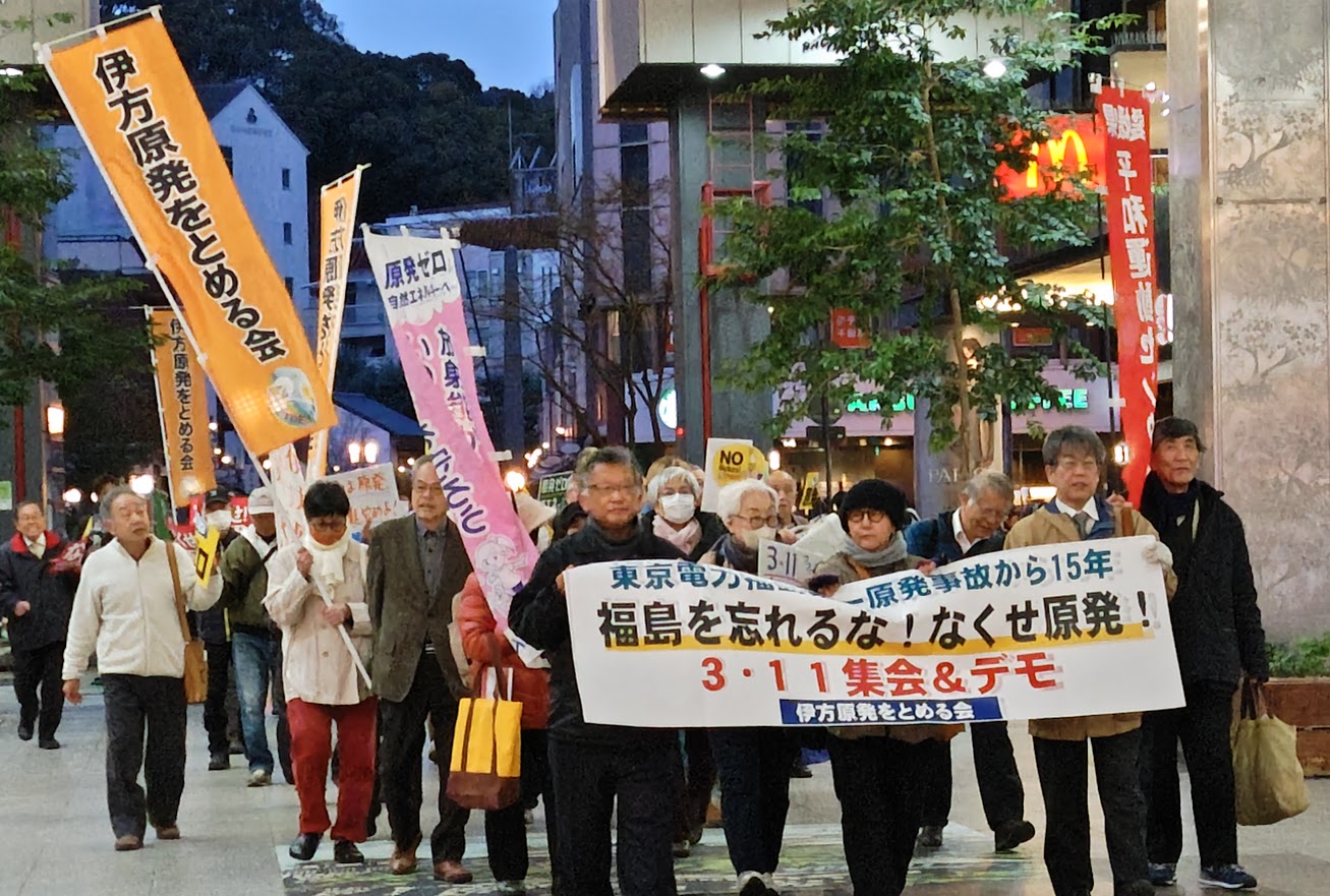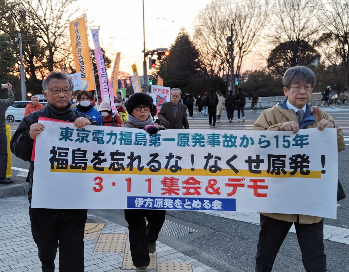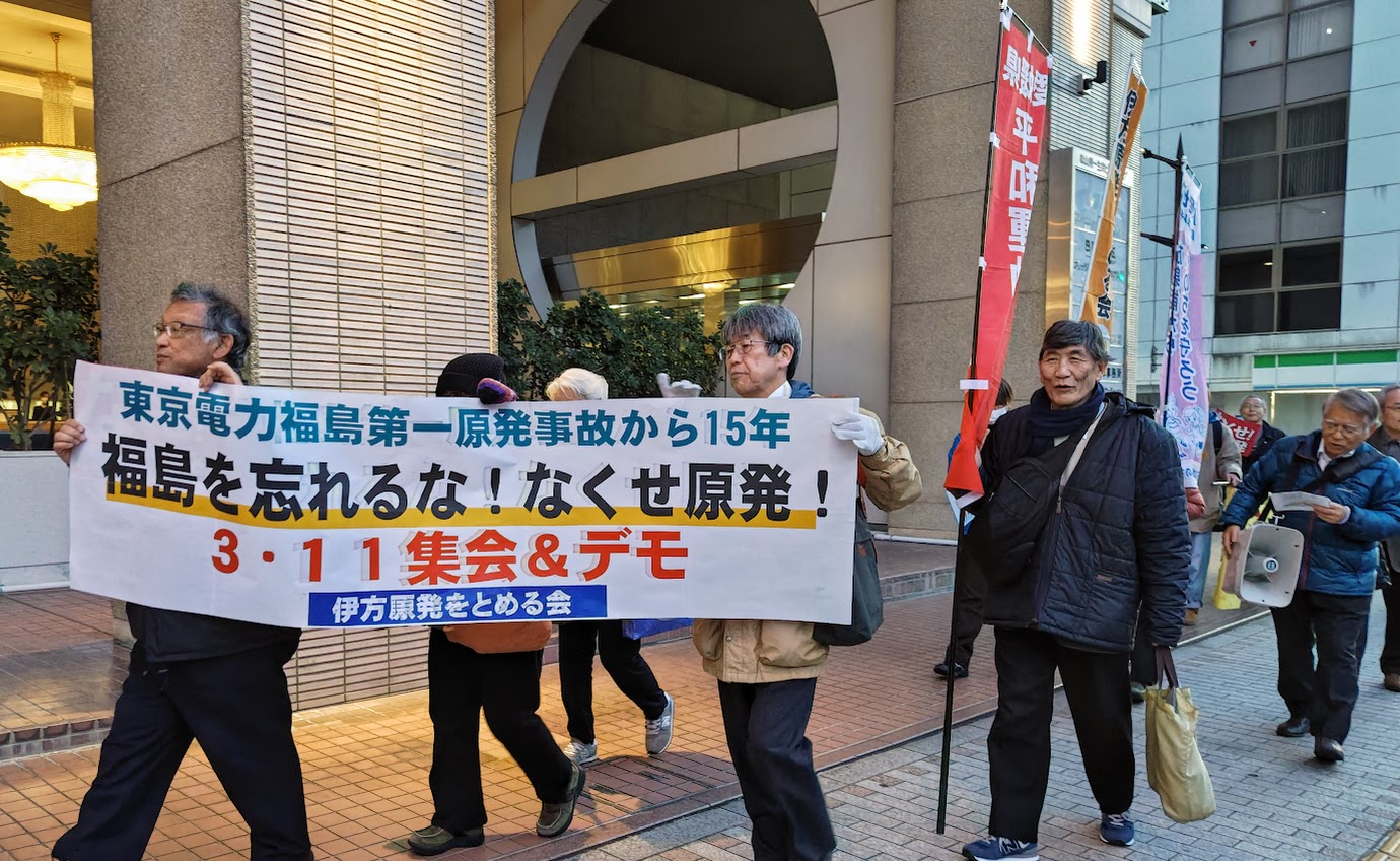 東電福島第1原発過酷事故から15年、非常事態宣言の解除もないままに、国は原発再稼働に狂奔しています。このような情勢下で3・11を迎えました。伊方原発をとめる会では城山公園東口(松山市堀之内)で集会&デモを開催しました。