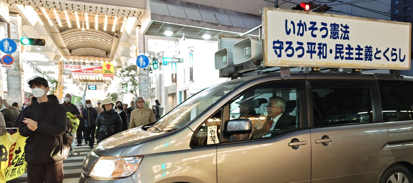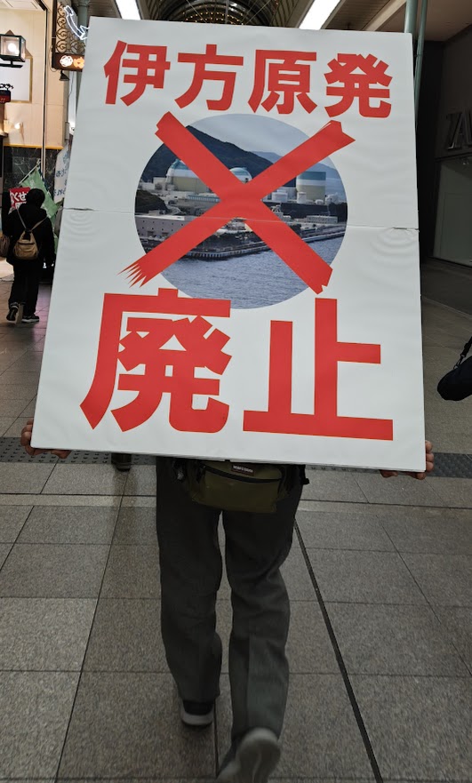 大街道を抜けて銀天街に入る交差点では、デモが通り過ぎる中、須藤事務局長が道行く人々に向かって伊方原発の廃炉を静かに訴えました。