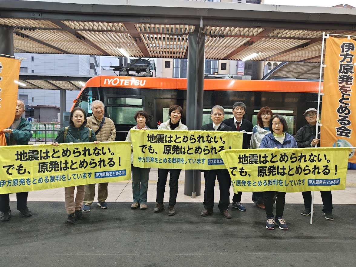 4月1日第1水曜日、雨模様のなか、松山市駅前の路上で伊方原発の廃炉を訴えて街頭行動をしました。例年通り4月からは17時半からの開始となりました。