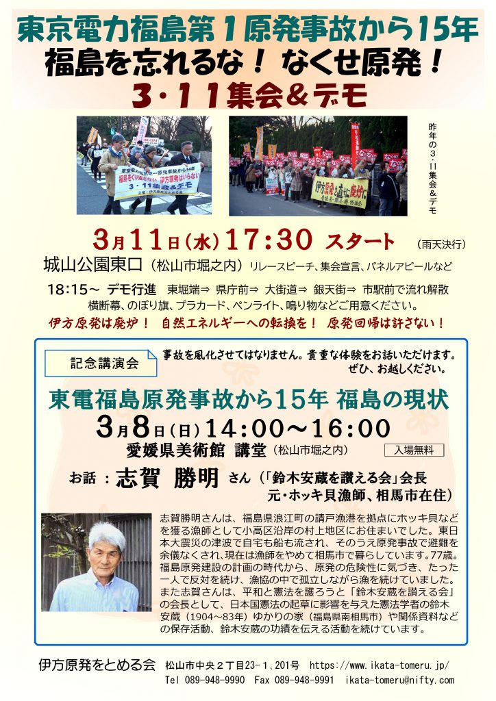 伊方原発をとめる会の第10回定期総会を、下記の要領で行います。 日時:11月1日(日) 13:30~16:30 場所...